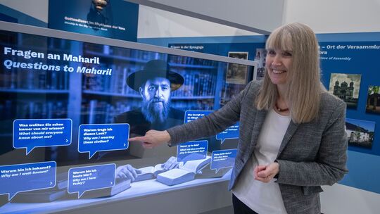 Anhand zahlreicher Originalexponate, Fotodokumente und Multimediastationen macht das Landesmuseum Mainz die jüdische Geschichte in Rheinland-Pfalz erlebbar. Befragt werden kann in der Schau sogar Rabbi Maharil, ein KI-generierter Avatar, den Museumsdirektorin Birgit Heide hier bei der Eröffnung vorstellt. Helmut Fricke/dpa