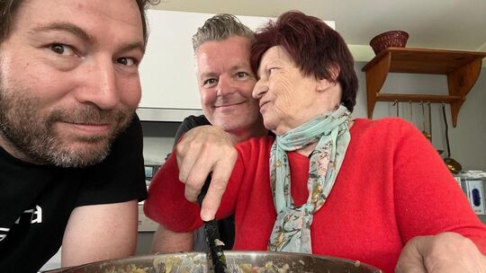 Für die Inklusionsdoku "Herbstresidenz" haben Tim Mälzer (nicht im Bild) und André Dietz (hinten) drei Monate lang in einem Seniorenheim in Bernkastel-Kues gedreht. Hier ist der Koblenzer Schauspieler mit Produzent Sascha Gröhl und Heimbewohnerin Ellen Meyer zu sehen. André Dietz