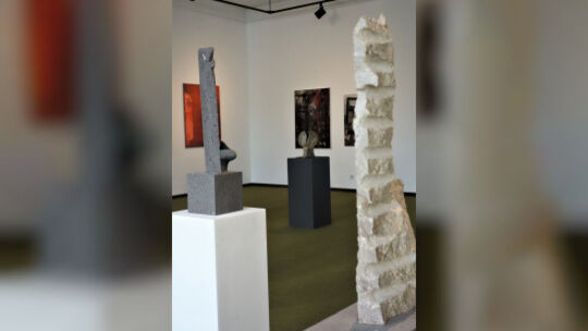 Bei der „form + farbe“ der AKM zeigen 40 Künstler ihre Arbeiten. Integriert in die Jahresausstellung sind dabei immer wieder auch die steinernen Engel (im Hintergrund) des 2021 verstorbenen Bildhauers Georg Ahrens.