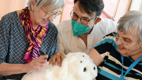 Paro heißt die kleine Robbe, die auch in deutschen Pflegeheimen schon seit einigen Jahren eingesetzt wird. Sie ist eine Maschine - regt die Seniorinnen und Senioren aber zur Interaktion und Kommunikation an. Waltraud Grubitzsch/dpa. picture alliance/dpa/dpa-Zentralbild