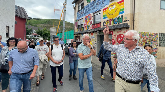 Rund 80 Teilnehmer nahmen am Rundgang durch Dernau teil. Der Ort ist von der Flut stark betroffen. Wo es beim Wiederaufbau gut läuft und wo es stockt, das zeigte Dernaus Ortsbürgermeister Alfred Sebastian (rechts) an mehreren Stationen des Rundgangs. Foto: Kevin Rühle Kevin Ruehle