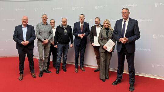 Die Initiative "Jetzt reden wir - Ortsgemeinden stehen auf" war am Dienstag zum zweiten Mal bei Ministerpräsident Alexander Schweitzer (re.) und Innenminister Michael Ebling (Vierter von re.) zu Gast (von li.): Matthias Hetger aus Hambuch, Berthold Schäfer aus Alflen, Johannes Hammes aus Zettingen, Stefan Thomas aus Faid, Thomas Schäfer aus Dohr sowie Nicole Jobelius-Schausten aus Ellenz-Poltersdorf. Bastian Hauck