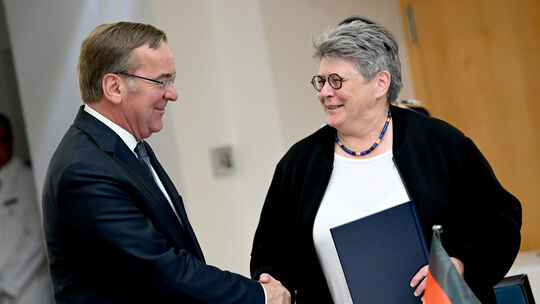 Verteidigungsminister und Amtschefin: Boris Pistorius bei einer Begegnung mit Annette Lehnigk-Emden, Präsidentin des Bundesamtes für Ausrüstung, Informationstechnik und Nutzung der Bundeswehr (BAAINBw). Das Amt soll neu strukturiert werden. Welche Folgen hat das für den Hauptstandort Koblenz? Britta Pedersen/dpa