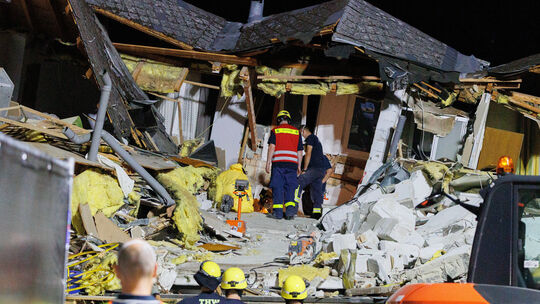 Nach dem Hoteleinsturz in Kröv räumten Feuerwehrleute und THW-Helfer Trümmer beiseite. Zwei Menschen starben bei dem Unglück an der Mosel im August 2024. Lando Hass. picture alliance/dpa