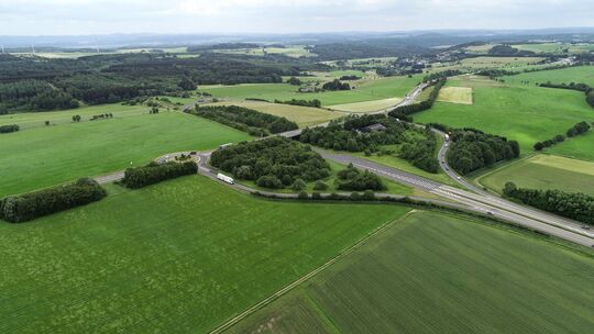 22.06.2018, Nordrhein-Westfalen, Blankenheim: Ein mit einer Drohne aufgenommenes Foto zeigt das Ende der Autobahn A1 bei Blankenheim. Die 25 Kilometer große Lücke der A1 zwischen Blankenheim und Kelberg in der Eifel soll nach neuen Planungen nun geschlossen werden. (zu dpa: «Rückt der A1-Lückenschluss in der Eifel näher?») Henning Kaiser. Henning Kaiser/dpa