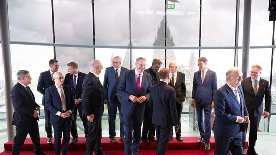 Große schwarze Limousinen steuern am Donnerstagmorgen das weiträumig abgesperrte Mainzer Staatstheater an. Um das Absperrband haben sich einige Schaulustige versammelt. Sie beobachten, wie zunächst Personenschützer aussteigen. Dann folgen bekannte Köpfe wie Söder, Wüst, Kretschmann und zehn weitere Länderchefs.