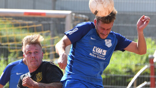 Marcus Meyer, der hier Friesenhagens Sebastian Erner beim Kopfball bedrängt, wartet mit Schönstein noch auf den ersten Auswärtspunkt. Foto: balu balu