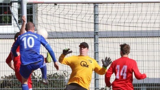 Werlaus Torwart Simon Vogt hielt gegen Ellenz-Poltersdorf (in Blau mit Spielertrainer Dominik Hartmann, der zum 3:3 traf) am Ende das 4:4-Unentschieden auf dem heimischen Hartplatz fest. Foto: Wolfgang Schmidt