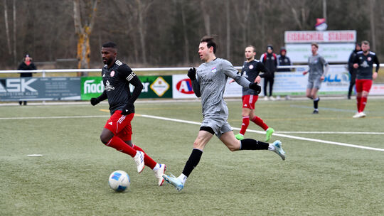 Im Finale des Lotto Rheinland-Pfalz Cups in Nentershausen standen sich die Spfr Eisbachtal (graue Trikots, hier mit Luis Hesse) und der SC Idar-Oberstein (hier mit Paulo) gegenüber. Am Ende setzten sich die Sportfreunde nach Elfmeterschießen durch. Andreas Hergenhahn