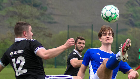 Die SG Bremm mit 3:0-Torschütze Philipp Hirschen (links) setzte sich daheim gegen den TSV Emmelshausen II um Maarten Grombein durch. Bremm hat nun 30 Punkte, die TSV-Reserve ist abgestiegen. Foto: Alfons Benz Alfons Benz