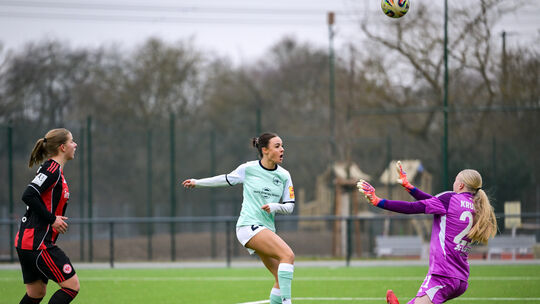 Die beste Andernacher Chance bei der 0:2-Testspielniederlage der SG 99 in Frankfurt vergab Rinesa Alija (Mitte), als sie den Ball frei vor Eintracht-Torhüterin Janne Krumme übers Tor schoss. Norina Toenges. Norina Tönges