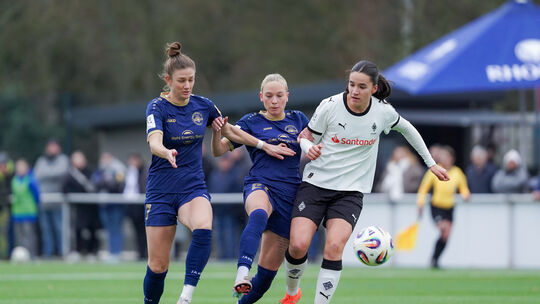 Das Andernacher Angriffsduo mit Carolin Schraa (links) und Isabel Pfeiffer, hier gegen Mönchengladbachs Fiona Itgenshorst, war beim 5:1 der Bäckermädchen gegen die Borussia nicht zu bremsen. Ob das dem FC Viktoria Berlin am Sonntag in Mendig gegen die SG 99 gelingt? Norina Tönges
