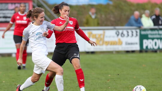 Aggressivität und Kampf um jeden Ball wie zuletzt beim 4:3 daheim gegen Ober-Olm fordert Holzbachs Coach Michael Tannhäuser von seinem Team um Top-Torjägerin Laura Rode (fünf Treffer) gegen Issel. Foto: B&P Schmitt K.F.Schmitt B & P Schmitt. B&P Schmitt