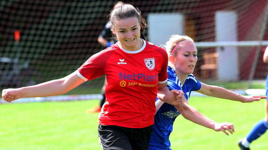 Trainer-Tochter Kim Tannhäuser (links) markierte das erste Saisontor für Regionalliga-Rückkehrer SV Holzbach, es war das zwischenzeitliche 1:1 gegen Mitaufsteiger SC Siegelbach. Am Ende verlor Holzbach im Simmerner Hunsrückstadion verdient mit 1:3 gegen die Gäste aus dem Kaiserslauterer Stadtteil Siegelbach. Foto: B&P Schmitt K.F.Schmitt B & P Schmitt. B&P Schmitt