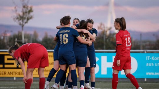 Den Gegnerinnen, in diesem Fall die SG 99 Andernach II (in Blau), beim Jubeln zusehen, das haben die Bad Neuenahrer Fußballerinnen (in Rot) nun zweimal in Folge hinter sich. Gegen den TuS Issel will der SC 13 wieder selbst jubeln. Tobias Jenatschek