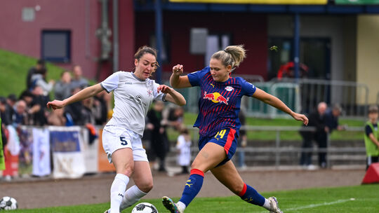 Andernachs Mittelfeldkraft Kathrin Schermuly, hier links im Duell mit der Leipzigerin Marleen Schimmer, droht wegen Achillessehnenbeschwerden für das Auswärtsspiel der SG 99 in Bochum auszufallen. Norina Toenges. Norina Tönges