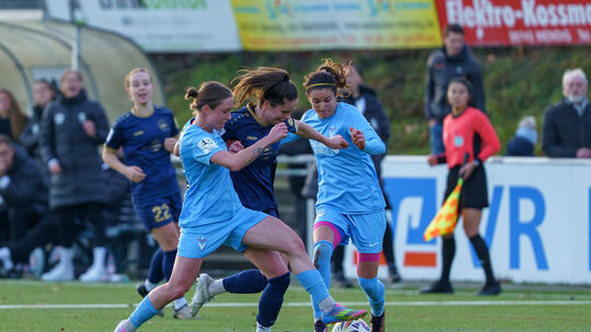 Maren Weingarz (in Dunkelblau) wird von zwei Berliner Spielerinnen angegriffen und im Anschluss zu Fall gebracht. So wie die Viktoria auch Andernach beim 0:2 zu Fall brachte. Norina Tönges