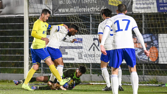 Hart umkämpft war das Duell zwischen dem TSV Emmelshausen (weiße Trikots) und dem SV Weitersburg, das mit einem leistungsgerechten 2:2 endete. Hier scheitert TSV-Akteur Sardar Ibrahim an Weitersburgs Torwart Felix Lehmann. Foto: Mark Dieler Mark Dieler