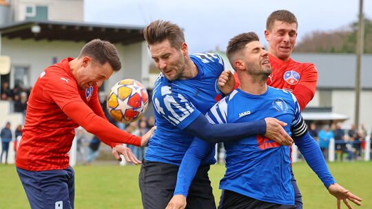 Super-Jahresabschluss für die SG Mörschbach/Argenthal/Liebshausen (rote Trikots, von links mit Robin Gründer und Marvin Schulzki): In Mörschbach schlug man den FC Metternich unerwartet hoch mit 5:0. B&P Schmitt
