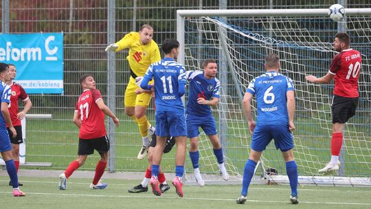Hier kann der Gegner, in diesem Fall der FC Urbar (rote Trikots), einen Gegentreffer verhindern, was aber zurzeit gegen treffsichere Metternicher (in Blau) gar nicht so einfach ist. 12:1 und 7:1 gewann die Germania zuletzt, nun empfängt der FC die Oberligareserve aus Emmelshausen-Karbach. Jörg Niebergall