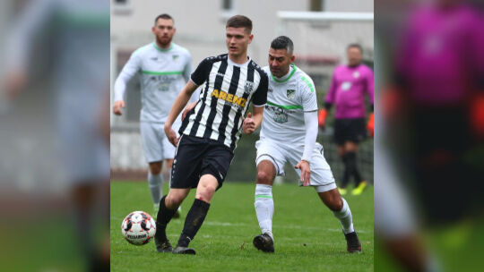 Der vor der Saison vom B-Ligisten SG Hambuch zum Rheinlandliga-Absteiger TuS Mayen gewechselte Tom Johann (In Schwarz-Weiß) hat das, was man im Fußball einen Lauf nennt: Er traf beim 4:2 gegen den SSV Boppard um Cadgas Karabalci in der sechsten Partie in Folge, dieses Mal war es das Tor zum 2:1-Halbzeitstand für den TuS. Foto: René Weiss René Weiss