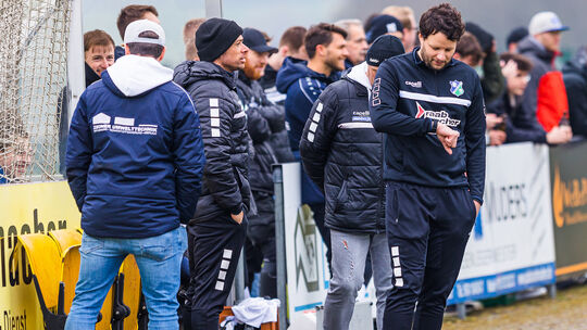 Nur im Trainingsanzug und an der Seitenlinie stehend wird Christoph Fahning (rechts) das Nachholspiel seiner SG Viertäler Oberwesel am heutigen Mittwoch (20 Uhr) in Oberwesel gegen die SG Vordereifel begleiten. Spielertrainer Fahning sah am Sonntag beim 1:1 in Oberzissen Gelb-Rot und muss einmal zugucken. Foto: hjs-Foto Hermann-Josef Stoffel