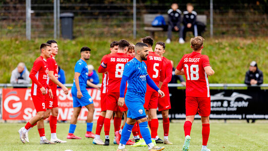 Zuletzt jubelten nur die anderen (hier die SG Augst): Der FC Emmelshausen-Karbach II (in Blau) um Kapitän Ozan Inal (vorn) und Mo Alhaj ist nach drei Niederlagen in Folge auf dem absteigenden Ast. Am Sonntag (15 Uhr) beim derzeit torhungrigen Dritten FC Metternich droht dem FCEK II die nächste Pleite. Hermann-Josef Stoffel. hjs-Foto