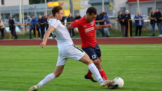 Serhii Tumko (in Weiß) trifft auch in der Rückrunde auf Mörschbachs Daniel Römer, dann allerdings nicht mehr im Oberweseler Trikot, sondern in dem des FC Emmelshausen-Karbach II. Tumko strebt einen Wintertransfer an, die Vereine müssen sich noch auf eine (im Winter frei verhandelbare) Ablöse einigen. Christian Kiefer