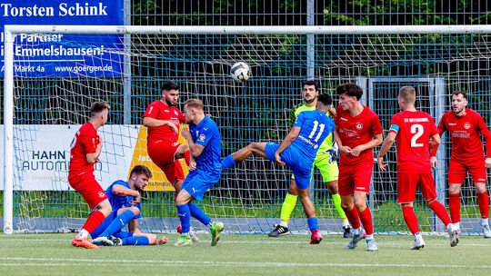 Die Abwehr des SV Untermosel (in Rot) um ihren Torwart Peter Dötsch (hinten in Gelb) wird am Sonntag im Heimspiel gegen Anadolu Koblenz besonders gefordert sein. Hermann-Josef Stoffel. hjs-Foto