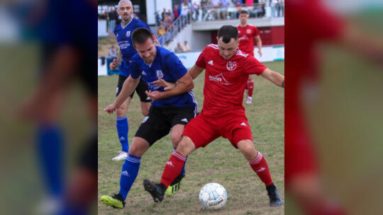 Fünf Tore in fünf Spielen: Vordereifels Lukas Mey (in Rot) gehört zu den Top-Torjägern der Liga, im Derby am Sonntag gegen Cochem um Michael Laux traf er beim 5:0 einmal. Mey und die SG reisen bereits am Freitag nach Oberzissen, die Cochemer empfangen am Sonntag im Moselstadion die SG Mörschbach. Foto: Alfons Benz