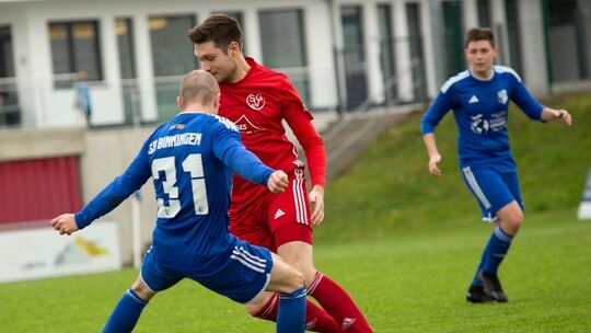 An Allerheiligen setzte sich die Vordereifeler Reserve gegen Binningen mit 5:0 nach Verlängerung im Kreispokal 1 durch, dabei sammelte Bezirksliga-Akteur Lorenzo Nebeler (in Rot, hier im Zweikampf gegen Binningens Lukas Thönnes) nicht nur Spielpraxis, sondern traf auch doppelt. Mit der Ersten geht es am Sonntag in Laubach gegen Aufsteiger Bogel. Foto: Sascha Berkele Sascha Berkele@GreenValleyMedia. Sascha Berkele