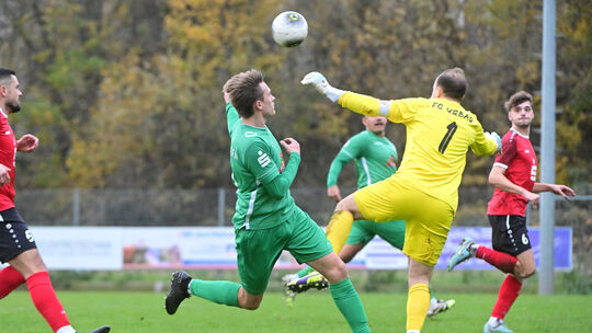 Gut im Griff hatte der Urbarer Torhüter Moritz Weißenborn (in Gelb) seinen Kasten beim 1:1 gegen den SV Oberzissen (in Grün Jannik Schneider); und nun erwartet der FCU den SV Weitersburg zum Verbandsgemeinde-Derby. Martin Gausmann. Ahr-Foto Martin Gausmann