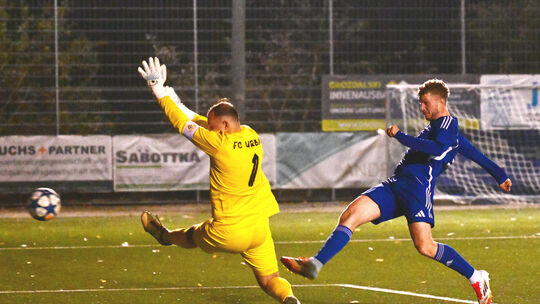 Mit dem 1:0 von Westums Max Palm (rechts), bei dem Urbars Keeper Moritz Weißenborn ohne Chance ist, ebnete der SG-Spieler den Weg zum Sieg von Westum/Löhndorf über das Bezirksliga-Schlusslicht. Martin Gausmann