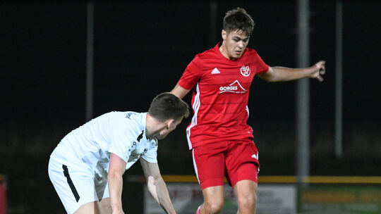 Heute geht es wie am Mittwoch in Oberwesel für Vordereifel wieder unter Flutlicht zur Sache: Die SG um Jannis Gorges (in Rot), der beim 7:1 ein Tor und ein starkes Spiel machte, ist bei Mülheim-Kärlich II zu Gast. Foto: Mark Dieler Mark Dieler