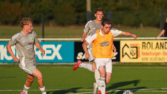 Während es Ahrbachs Jan-Christian Weber (am Ball) nicht gelang, den Ball im Tor unterzubringen, traf Luca Reichmann (hinten rechts) gleich doppelt für den FC Borussia Niederroßbach (links Lasse Elias Theis). Horst Wengenroth. Photo: (c) Horst Wengenroth 2025