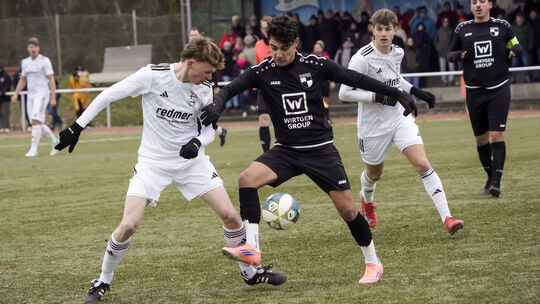 Ein heißes Derby bei eiskalten Temperaturen: Moritz Kuhn (vorne in Weiß) verletzte sich ohne Gegnereinwirkung bereits in der ersten Halbzeit schwer. Sein TuS Asbach setzte sich aber mit 2:0 gegen Zyad El Mahdaoui (vorne in Schwarz) und den SV Windhagen durch. Heinz-Werner Lamberz