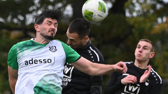 Burhan Tuncdemir (in Grün-Weiß) und seine SG 06 Betzdorf mussten sich gegen Can Sülzen (beim Kopfball in Schwarz), Jan Hilbers (dahinter in Schwarz) und den SV Windhagen (in Schwarz) mit einem Remis zufrieden geben. Manfred Böhmer/balu
