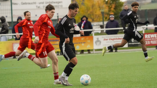 Klar die Nase vorn: Nach einer halben Stunde konnten Luke Steinebach (vorne in Rot) und die SG St. Katharinen ihren Gegnern nicht mehr richtig folgen. Die SG Malberg zog das Tempo an und siegte mit 1:7. Sommer-Rückkehrer Sebastian Rosbach (am Ball) steuerte drei Treffer zum Erfolg bei. Heinz-Werner Lamberz