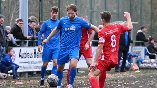 Zweimal gingen Fabian Hüsch (vorne in Blau) und die SG Müschenbach in Hachenburg als Sieger vom Platz. Das soll auch am Freitagabend gelingen, beim Debüt von Neu-Trainer Torsten Gerhardt, dessen Ex-Kapitän Julius Müller (rechts) mit Malberg beim TuS Burgschwalbach die eigene Siegesserie ausbauen will. Jürgen Augst/byJogi