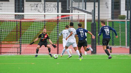 Die Westerburger Defensive um Niklas Henry und Lars Hendrik Jung (blaue Trikots von links) kommt den quirligen Höhrern nicht hinterher: Bruno Antunes (in Weiß mit der Nummer 17) steuert hier auf Jonathan Kloft, den besten Heimakteur am Samstag, zu und erzielt wenige Sekunden später das 0:2. Zehn Minuten zuvor sorgte bereits Jaider Cardona Chicaiza (Nummer 24) für die Führung. Horst Wengenroth. Photo: (c) Horst Wengenroth 2025