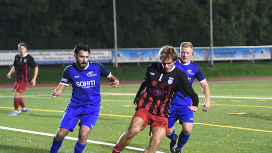 Die SF Höhr-Grenzhausen (in Blau, von links Vangeli Kamtsikis und Christian Schauer) zeigten im Mons-Tabor-Stadion eine starke Leistung und waren dem Sieg näher als der favorisierte TuS Montabaur um Paul Reichelt. Andreas Hergenhahn