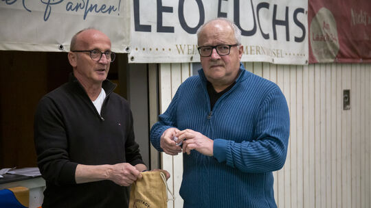 Beim Hallenmasters in Treis-Karden haben Michael Melzer (links), Spielleiter des Fußballkreises Hunsrück/Mosel, und sein Vorgänger Karl Scheid den Weg ins Endspiel im Kreispokal 1 und 2 ausgelost. Sascha Berkele