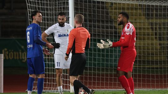 Die kurioseste Szene des Abends: Bei einem Abstoß für die Gastgeber legte sich Kapitän Meric-Nuh Gültekin (links) den Ball am Fünfer mit der Hand kurz zurecht und passte ihn kurz auf seinen Keeper Josué Duverger (rechts). Der stoppte sich den Ball und legte sich ihn aber auch nochmal mit der Hand in die richtige Position, was regelwidrig war. Schiedsrichter Jason Lieser gab Freistoß am Fünfereck, 1:0-Torschütze Damjan Marceta (in Weiß) legte kurz auf Mirko Schuster ab, der zum 2:0 für die Gäste traf. Am Ende hieß es 4:1. Jörg Niebergall