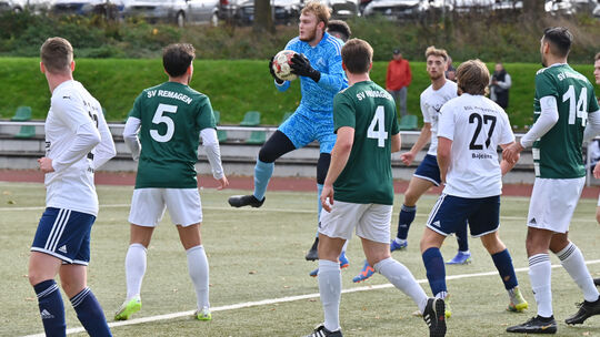 Nach dem 2:4 zu Hause gegen die SG Landskrone (weiße Trikots) will sich der SV Remagen (am Ball Torwart Felix Güttes) nun bei Fortuna Kottenheim schadlos halten, während Landskrone zu Hause gegen Ettringen den vierten Sieg in Folge anpeilt. Foto: Vollrath Hans-Jürgen Vollrath