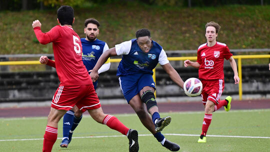 Ein gefühlvoller Schlenzer von Courage Moses (Mitte) - der Bad Breisiger brachte seine SG gegen die SG Saffig/Miesenheim (in Rot) mit 1:0 in Führung, am Ende siegte Bad Breisig mit 2:1. Martin Gausmann