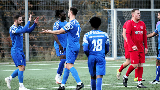 Jubel beim TuS Niederberg (in Blau), und große Enttäuschung bei den Fußballern der Reinhardt's Elf: Die Niederberger setzten sich mit 5:0 durch. Jörg Niebergall