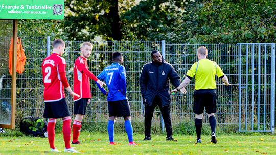 Tam Nsaliwa (Zweiter von rechts), früherer kanadischer Nationalspieler und seit genau zwei Jahren Trainer der Spvgg Cochem, war beim 2:2 in Hausbay (rote Trikots) im regen "Austausch" mit Schiedsrichter Sebastian Fiege. Mit dem Punkt konnte Nsaliwa leben, am Sonntag (15 Uhr) trifft Cochem (Erster in der Heimtabelle) im Moselstadion auf den Spitzenreiter Morshausen (Erster in der Auswärtstabelle). hjs-Foto