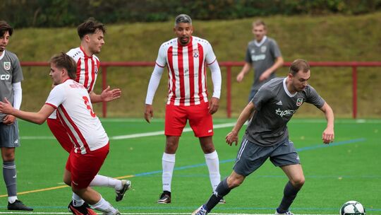 Die DJK Neustadt-Fernthal (in Rot-Weiß) drehte einen Rückstand und konnte knapp gegen den SV Rheinbreitbach (in Grau) gewinnen. Jörg Niebergall