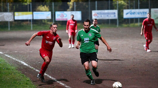 Noah Schneider (grünes Trikot) versucht hier den nach vorne preschenden Leonardo Reinhardt von der Reinhardt's Elf zu stoppen. Andreas Hergenhahn