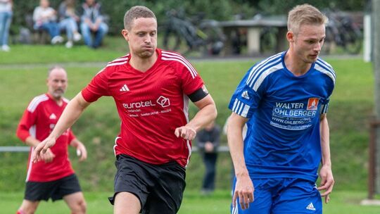 Nach dem 1:0-Heimsieg in Lütz gegen Hausbay geht es für Vorderhunsrück (in Blau) um Tobias Zens am Sonntag nach Cochem, die Hausbayer um Kapitän Alexander Merg empfangen zu Hause am Sonntag den Bezirksliga-Mitabsteiger Niederburg. Merg wird dabei wegen einer Adduktorenverletzung ausfallen. Foto: Sascha Berkele Sascha Berkele